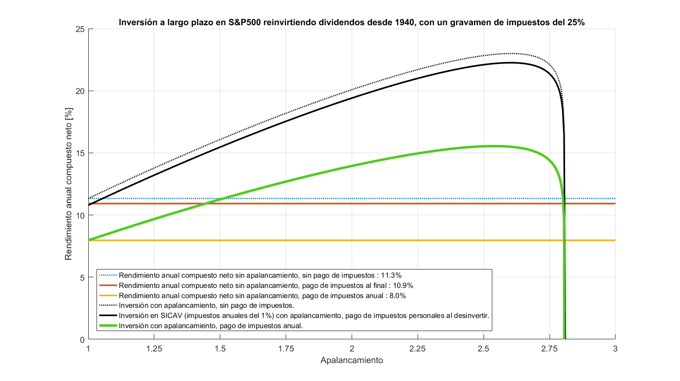 Vamos a simular qué sucede si nos apalancamos. En este caso, vamos a simular el pago de impuestos anual, porque no te va a ser posible operar por ejemplo con opciones financieras a largo plazo, y seguramente estarás muy cerca de tener que rehacer la cartera año tras año. Pero hay una excepción, si podemos acceder a una sociedad, o fondo de inversión, o ETF, o cualquier otra opción que sigua una estrategia de inversión permanente en el S&P500 reinvirtiendo dividendos con apalancamiento y que pueda invertir capital con bajos impuestos, por ejemplo, con una sociedad de inversión colectiva (SICAV), podríamos pagar anualmente ese bajo nivel de impuestos y retrasar nuestro pago personal del 25% al final del todo cuando queramos desinvertir nuestro capital. Así que vamos a hacer las dos simulaciones, y vamos a graficar el rendimiento anual compuesto para diferentes niveles de apalancamiento. Eso es lo que se ve en la siguiente gráfica.