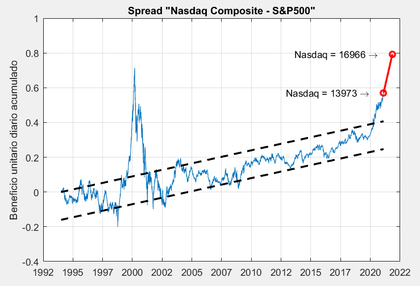 Hay muchas señales de burbuja en el Nasdaq, vamos a ver una muy clara analizando el spread entre el índice Nasdaq Composite (^IXIC) y el índice SP&500 (^SPX).Si pensamos en la naturaleza de estos dos índices, se nos puede ocurrir una idea sencilla y rentable de inversión a largo plazo. El S&P500 engloba las 500 mayores compañías que cotizan en la bolsa de Nueva York, y el Nasdaq Composite engloba a todas las compañías del mercado Nasdaq que son principalmente tecnológicas. Si invertimos a largo en el Nasdaq Composite e invertimos al mismo tiempo a corto con el mismo capital en el S&P500, lo que estamos haciendo es aislar el plus de rendimiento económico que supone el avance tecnológico respecto a la economía tradicional.