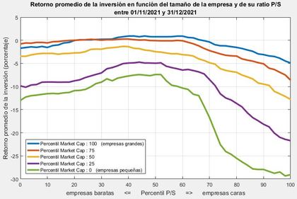 Vamos a verlo en una gráfica. He analizado todas las empresas del mercado americano NYSE+NASDAQ y he calculado el retorno promedio desde el 1 de noviembre de 2021 al 31 de diciembre de 2021, dividiendo las empresas en grupos en función de su capitalización y de su ratio P/S (Price/Sales). El resultado se ve en la siguiente gráfica (pulsa para ampliar). En promedio, las empresas grandes y con P/S razonable han estado laterales, y el resto de empresas cuanto más pequeñas y con más alto P/S mayor ha sido su caída. También ha habido cierta venta de empresas baratas pequeñas.