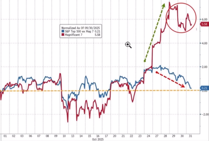 Comparación del S&P500 ex7 vs mag 7 en octubre. El mercado está cada vez más peligrosamente centrado en los 7 magníficos. Cada vez se están dando comportamientos más extremos en el índice, cada vez más centrado en la IA y los 7 magníficos.