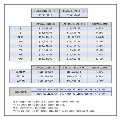 En la siguiente imagen y tabla se puede ver la evolución de la cartera y el resultado de los últimos dos meses.
