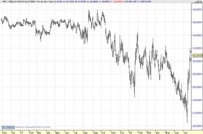 Ayer ya fue el colmo con Wachovia. En 3 meses el banco ha acumulado una pérdida de 8662 millones de dólares y adicionalmente anunciaron un recorte del 80% del dividendo y con semejante panorama sus acciones se dispararon un 32% al alza en la sesión para continuar subiendo hoy. No quiero ni pensar qué escenario descontaba el mercado con las terroríficas bajadas previas de estas acciones si con semejantes resultados tuvo esa subida.