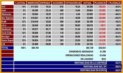 El resultado neto de ambas carteras durante este año ha sido de un -30.15%. En la práctica, mis carteras "reales" han perdido algo más en el caso de la europea y bastante menos en la americana como resultado del cierre de posiciones en valores con poca visibilidad de resultados (moodys) y su sustitución por BNI y WFC, cambios que no reflejé en su día en el blog.