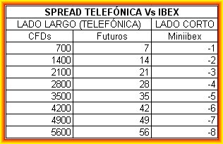 Es decir, en el ejemplo citado anteriormente spread "telefónica mejor que el ibex" si tomamos la posición comentada alcista de 16.000 euros de telefónica, ya sea mediante CFDs o Futuros, hemos de abrir una posición corta o bajista equivalente a 16.000 euros en el ibex.