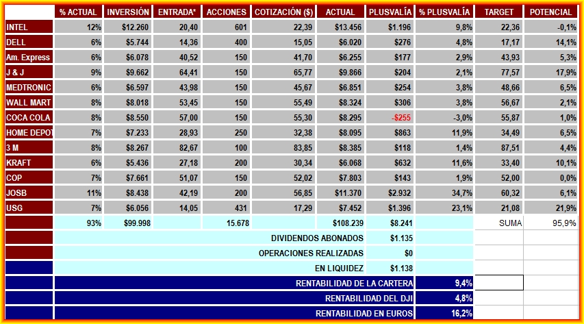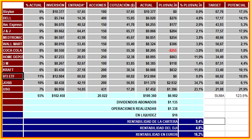 A día de hoy y tras este primer trimestre mi cartera americana presenta una importante rentabilidad del 9.4% valorada en dólares y del 16.2% valorada en euros como se detalla a continuación