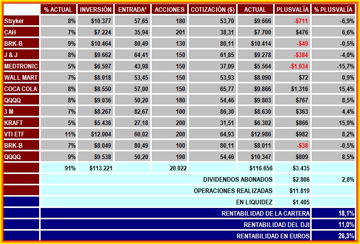 Un 18.1% de rentabilidad en dólares (un 26.3% en euros) que creo que es un excelente resultado comparado con el DJI (+11%) y desde luego con los índices europeos.