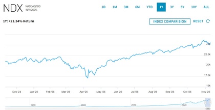 Evolución del Nasdaq-100 en 2025: +21,34 % de rentabilidad en el último año - Fuente: indexes.nasdaqomx.com