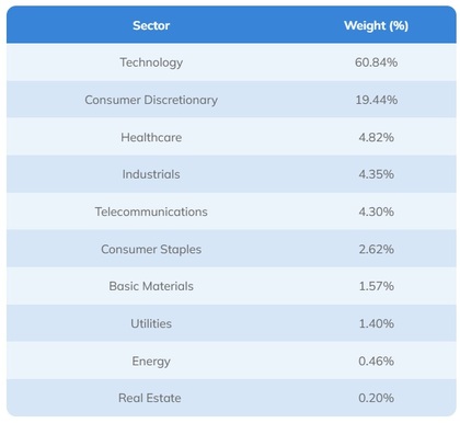 Actualmente, el sector tecnológico representa alrededor del 60,8 % del índice, seguido por el consumo discrecional con un 19,4 % y la salud con un 4,8 %. Otros sectores como industria y telecomunicaciones rondan el 4 %, mientras que el resto —como consumo básico, materiales o energía— tienen una presencia más reducida.