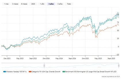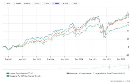 Rentabilidad 3 años: alrededor del +90 % para los principales ETFs del Nasdaq-100 (a noviembre 2025).