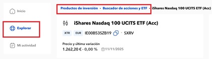 Escribe “Nasdaq 100” o el ISIN del producto que te interese (por ejemplo, IE00B53SZB19 para el iShares Nasdaq 100 UCITS ETF (Acc) o IE0032077012 para el Invesco EQQQ Nasdaq-100 UCITS ETF).