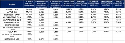 La composición del índice Nasdaq 100 en la tabla parece bastante fiable, por estar contrastada en 2 web diferentes. Si bien hay pequeñas diferencias según la web consultada, slickcharts o stockanalysis (siempre en la misma fecha; la de la tabla es de slickcharts.com). Pero ninguna coincide con los ETFs.