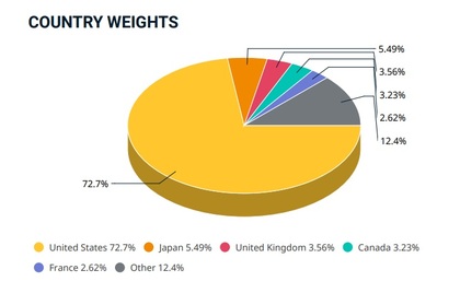 Entre los 23 países que forman parte del índice destacan Estados Unidos, con una ponderación de aproximadamente el 72,7 %, seguido de Japón con un 5,5 %, y Reino Unido con un 3,6 %. A estos les siguen Canadá (3,2 %) y Francia (2,6 %), además de otros mercados desarrollados como Alemania, Suiza o Australia.
