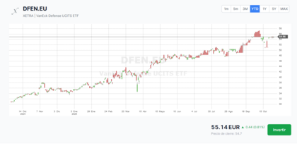 Desempeño del VanEck Defense UCITS Eso sí, no es un fondo para todo el mundo. Su volatilidad ronda el 22%, lo que significa que puede tener movimientos bruscos en el corto plazo. Y al estar denominado en dólares sin cobertura de divisa, también asumirás el riesgo del tipo de cambio si inviertes desde la zona euro.