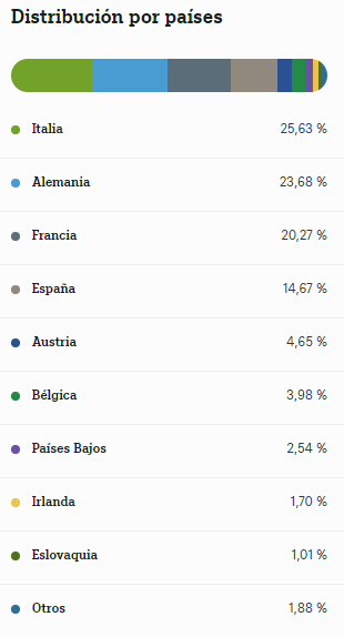 Como podemos observar, el índice que replica este ETF está más concentrado, invirtiendo en menos emisores y teniendo más exposición a países como España e Italia, que ofrecen algo más de rentabilidad en sus bonos.