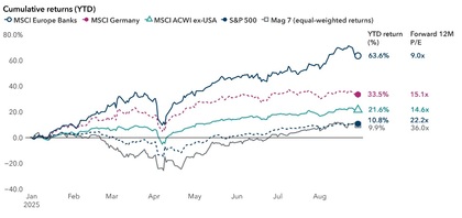 Rendimiento de distintos índices bursátiles internacionales frente al mercado estadounidense (S&P 500 y Mag 7) - Fuente: capitalgroup.com