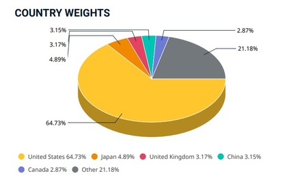Entre los 49 países que forman parte del índice destacan Estados Unidos, con una ponderación de 64.73%, seguido de Japón con un 4.89% y Reino Unido con un 3.17%. A estos les siguen China con un 3.15% y Canadá con un 2.87%, además de otros mercados desarrollados como Francia, Suiza o Australia.