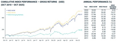 Comparativa de Rentabilidad Acumulada y Anual de los Índices MSCI ACWI, MSCI World y MSCI Emerging Markets (2010-2025) - MSCI.com (octubre 2025)