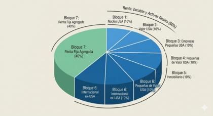 La CoffeeHouse Portfolio no es un fondo global genérico; es un puzle de siete piezas de bajo coste donde cada una cumple una misión específica. Se divide en un 40% de renta fija para dar estabilidad y un 60% de activos de crecimiento fragmentados para capturar todas las fuentes de rentabilidad del mercado.