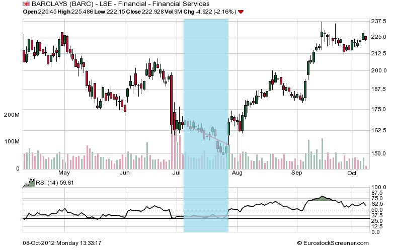 Se puede comprobar como mientras el precio presenta una estructura alcista durante los 15 días que abarca el área sombreada en azul celeste, el RSI(14) presentaba una estructura bajista marcando máximos descendentes y mostrando una regresión lineal negativa. Tras la confirmación de la divergencia bajista, el precio del activo cayó con fuerza.