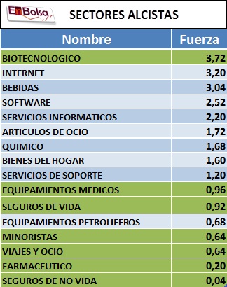 Ordenados de mayor a menor fortaleza alcista, se presentan los 15 mejores sectores europeos para realizar una operativa alcista a corto plazo. El sector “Biotecnológico” es el que mayor fortaleza presenta con un ratio del 3,72 seguido de cerca por el sector de “Internet” con un ratio del 3,2 y, cerrando el podium el sector de “Bebidas” con un ratio del 3,04.