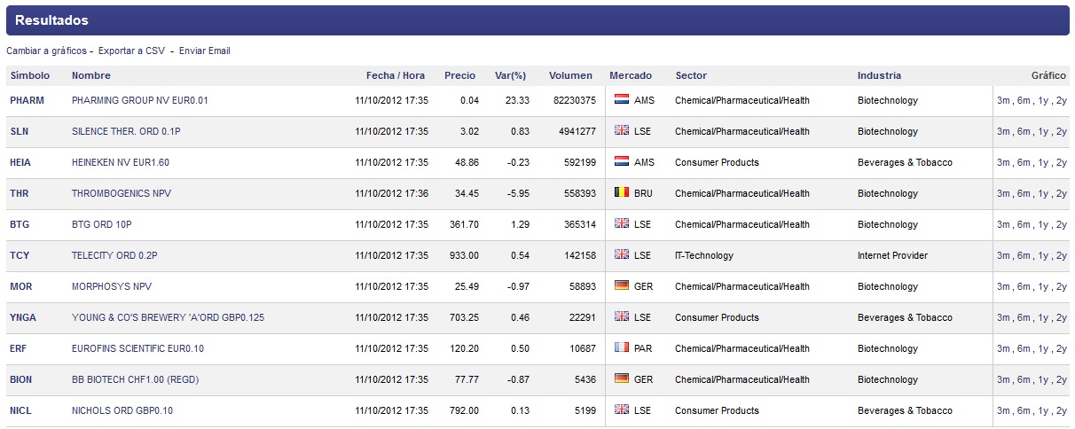 Una vez comentado lo importante de realizar un estudio previo de la evolución o fortaleza alcista de las principales industrias y sectores, es el momento de poner sobre la mesa qué acciones no están aportando señal de compra inminente. Para ello, utilizamos el buscador EuroStockScreener que nos permite encontrar las acciones europeas que, filtradas además por industrias y sectores, se presumen como grandes oportunidades de inversión al alza para las próximas sesiones.