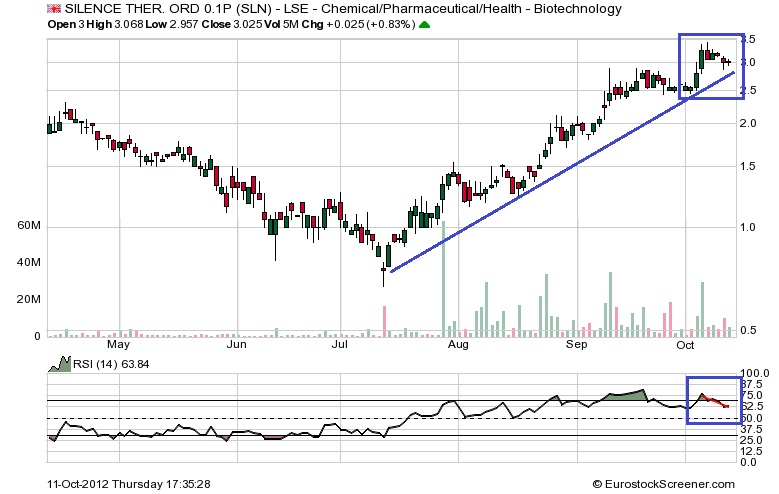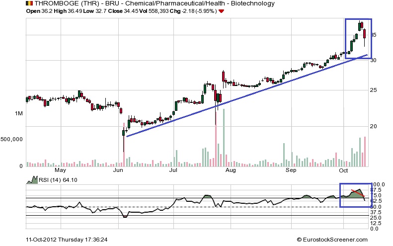 Otro ejemplo claro de todo lo desarrollado anteriormente es este segundo gráfico que se muestra. Perfecta estructura alcista a corto plazo que ha llevado al activo a acumular sobrecompra en su oscilador de momento RSI(14) y que, tras varias sesiones por encima del nivel de 70, el título está realizando una perfecta reestructuración hacia la directriz alcista que se desarolla desde principios del mes de JUN12, momento en el que se puede volver a ver grandes alzas en el título.