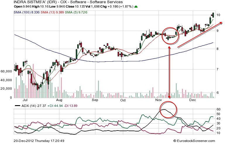 Tal y como se aprecia en la imagen anterior, tras estar cotizando la media móvil simple de 5 periodos por debajo de la media móvil simple de 13 periodos durante al menos 5 sesiones y, tras desplegarse una vela con cuerpo alcista y con un ADX(14) por encima del nivel de los 35 puntos, se activó a mediados del mes de NOV12 la señal de entrada en largo que, a día de hoy, tendría como resultado una operativa rentable.