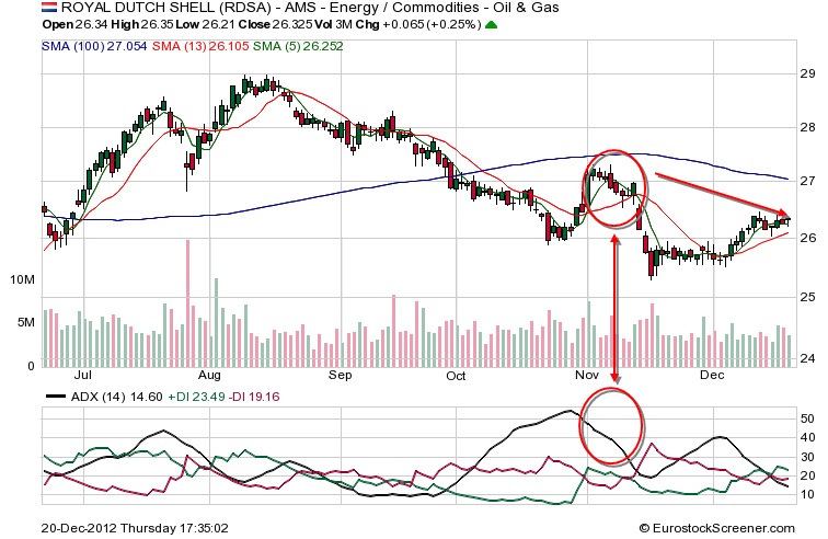 Tal y como se aprecia en la imagen anterior, tras estar cotizando la media móvil simple de 5 periodos por encima de la media móvil simple de 13 periodos durante al menos 5 sesiones y, tras desplegarse una vela con cuerpo bajista y con un ADX(14) por encima del nivel de los 35 puntos, se activó a principios del mes de NOV12 la señal de entrada en corto que, a día de hoy, tendría como resultado una operativa rentable.