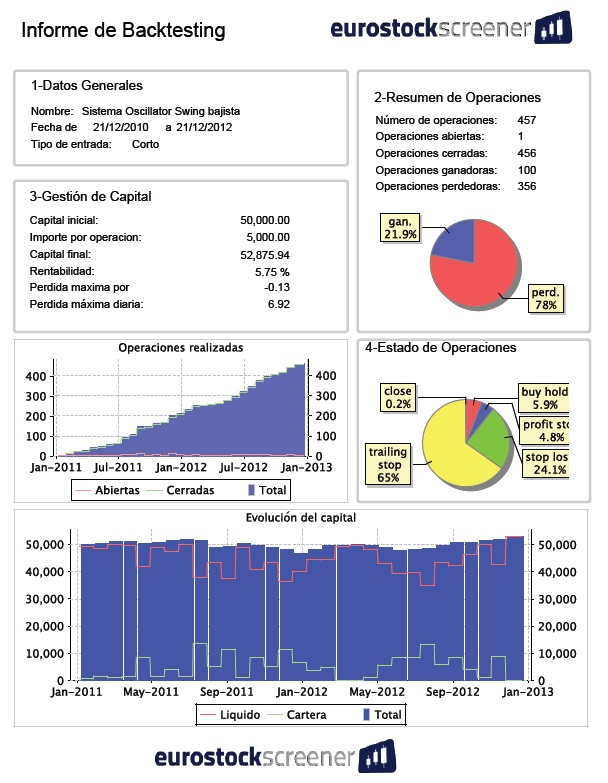 Ya tenemos programado el sistema en nuestra plataforma EuroStockScreener que nos permite obtener sañales diarias de entrada tanto en largo como en corto inminentes. Ahora se procederá a la aplicación, a modo de ejemplo, de un BackTesting con este sistema durante los dos últimos ejercicios.