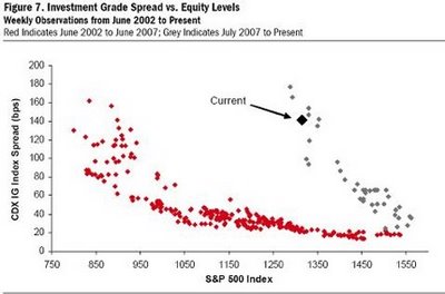 El spread a que cotiza el yield de una emisión es la diferencia que una empresa (o estado) debe pagar de más por encima del tipo de interés oficial para que la deuda que pretende colocar entre los inversores sea atractiva y pueda venderla. Lógicamente, cuanta mayor sea la confianza en esa empresa, menor será el diferencial sobre el tipo oficial que deberá pagar a los inversores para que estos les presten su dinero a cambio de estos pagarés, bonos, etc. Obviamente a menor confianza el diferencial se disparará. En la actualidad dicho spread alcanza niveles altísimos debido a la desconfianza reinante desde el pasado verano. Por lo tanto los seguros o coberturas Credit Default swaps, cuyo índice sobre estos CDX se muestran en el gráfico del encabezado, se encarecen proporcionalmente. Podéis compararlo con este gráfico de la derecha correspondiente al spread sobre el tipo del Tesoro americano a 5 años que había en el 2004. Además, hoy en día el mercado está tan seco que se pueden sufrir diferenciales en la propia cotización de la deuda entre bid y ask (oferta y demanda) verdaderamente demenciales.Lo que el gráfico y la lógica nos dicen es que siempre ha existido una relación entre la confianza o desconfianza en la deuda emitida por una empresa, y la confianza o desconfianza de los inversores en la cotización de las acciones de dichas empresas en la bolsa. Es decir, cuanta mayor confianza en la deuda corporativa, menor spread sobre el tipo oficial, menor CDX y mayor cotización en bolsa de sus títulos. Y viceversa. Absolutamente racional y hasta hoy ley universal de la economía moderna. Pues bien, desde que estalló la llamada crisis de crédito, esta relación lógica ha dejado de existir.