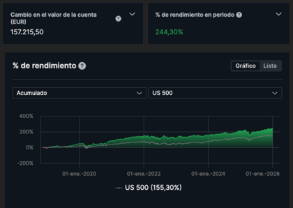 Más sorprendente es que también estoy por encima de SP500 si nos remontamos hasta 2011, cuando abrí la cuenta en Clicktrade; 470% de rendimiento en mi cuenta, vs 432% del SP500. Y digo sorprendente porque hasta finales de 2018, cuando entré en Apple, sólo invertía en acciones españolas (fueron años donde mi foco principal eran las preferentes, y la cartera de bolsa era algo más secundario). Tomando el periodo desde que entré en bolsa americana hasta ahora, sería 244% para mi cartera vs 155% para el SP500... son muy buenas rentabilidades, y aún así muy eclipsadas por la comparación con las Eroski.