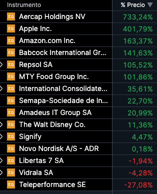 En la foto histórica, este año llevo 6 baggers* en cartera: Aercap es la campeona con un +733%, segundo puesto para Apple con un +401%, y luego Amazon, Babcock, Repsol y MTY todos por encima del +100%. En la parte negativa, sólo Teleperformance (-27%) con doble dígito en rojo.