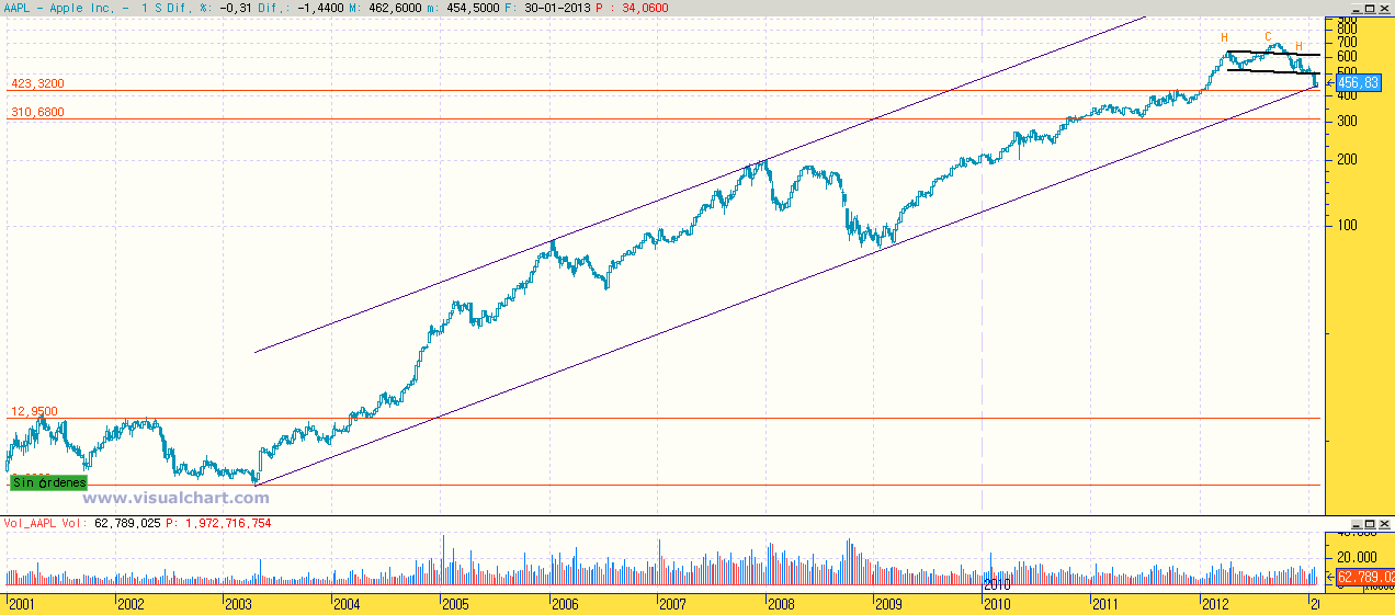 Nos centraremos ahora en la evolución del valor y vemos que la subida en vertical desde finales de 2009 en zonas de 200 dólares hasta los 700 comentados anteriormente hace que el vértigo salga a relucir.
