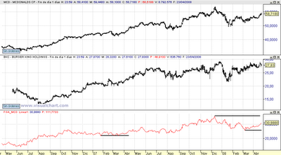 No obstante en el medio plazo, el Spread ha dibujado una secundaria bajista que durante este 2008 podría variar esta dinámica y volverse negativa para Mcdonald's y positiva para Burger King.