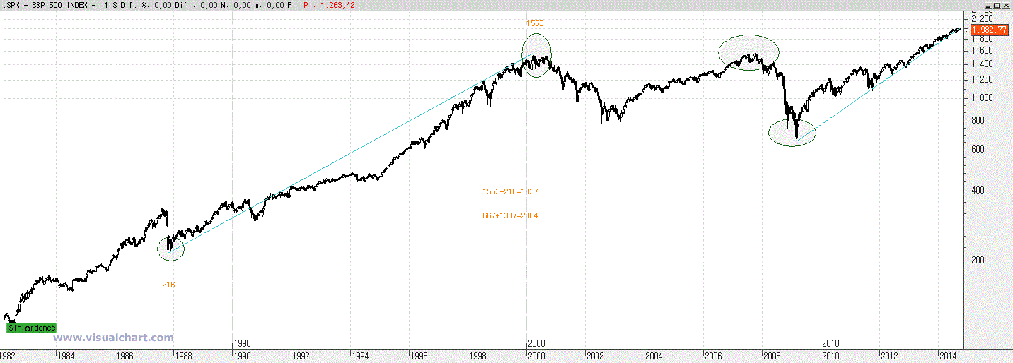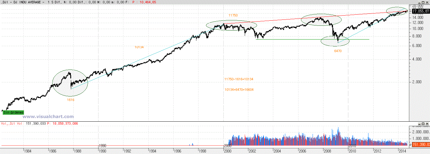 Si nos fijamos bien en el gráfico del Dow de Industriales, desde el mínimo del crack del 1987 hasta los máximos de la explosión de las puntocom, el diferencial en puntos nos da 10134 puntos.