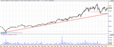 Parece ser que la venta de aspirinas para las jaquecas a los poseedores de la Bayer se va a disparar en breve ya que además de mantener intacto el cambio de estructura primaria bajista, el rebote a la zona de los 60 Euros esta casi agotado.
