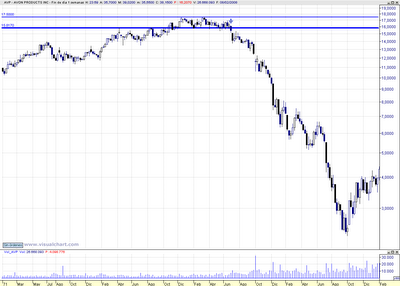 El primero de todos pertenece a AVON, se acordarán ustedes de la famosa frase “Avon llama a tu puerta”. El valor se paseó haciendo un lateral desde finales del 1972 hasta julio de 1973, entonces ocurrió lo inesperado que no fue otra cosa que la crisis del petróleo de dicho año. Gozando de una salud contable envidiable y sus fundamentos a prueba de bombas el valor se desplomó desde los 16$ hasta los 2.5$ en un año. Los balances de Avon seguían gozando de números positivos, sus fundamentos envidiados, pero su cotización prácticamente rozaba el infierno. Muchas agencias de análisis daban sus recos a diario desde la rotura en los 16$ de fuerte compra y cada dia eran más los incautos que haciendo caso de ellas compraban y compraban acciones y veían impotentes como caían hacia los cambios anteriormente descritos.