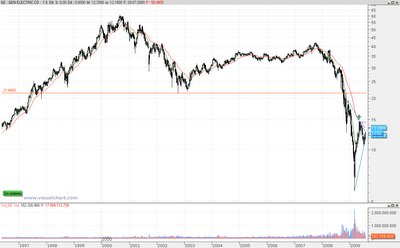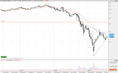 Al grano, la General Electric es un valor seguido por todo el mundo incluido el amigo Buffett y la abuela del susodicho, la fuerte caída de la GE no es debido a la crisis patatera bancaria ni a la desaparición de la clase media como todo el mundo comenta, la caída desde los soportes clave situados entre los 21-22$ se debió al cambio de primarias que junto al amado S&P 500 en octubre de 2008 puso a cada uno en su sitio.