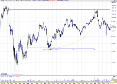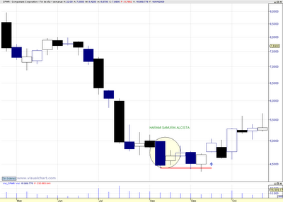 En el grafico semanal de COMPUWARE CORPORATION y después de una fuerte bajada en muy poco tiempo, aparece una Harami Samurái alcista con todo su esplendor, que además actuó de soporte en la corrección posterior del triangulo que formó.