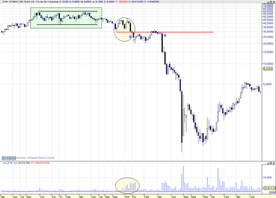 El caso de Dynegy Inc. es un claro ejemplo de distribución con tres pautas envolventes bajistas semanales, donde los volúmenes aumentaron en todas ellas, avisando de lo que posteriormente iba a pasar.