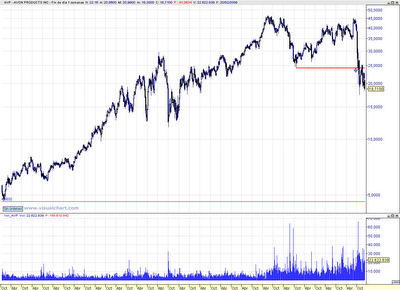 Un doble techo de cuatro años asusta un poquitín, tengo entendido que están captando a mamas para vender otra vez productos de la empresa, difícil venta en estos momentos ya que su futuro no parece muy alentador.No estaba claro la rotura de la última secundaria hasta la violación del último mínimo situado en los 24$ de 2005, la caída en vertical obedece más a la situación global pero después del movimiento último y su vuelta atrás el peligro de tener este valor en cartera aumenta exponencialmente ya su principal tendencia es bajista y su recorrido hacia el sur puede ser duro.