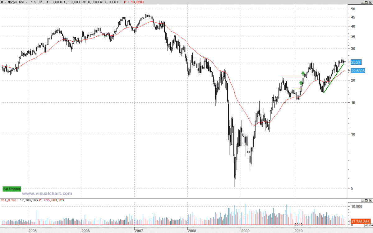 Hace casi un año, escribí un artículo sobre Macy´s, en aquellos momentos la acción jugueteaba con un Pull-Back derribado por la fuerza compradora del momento y haciendo temblar los cimientos de las posiciones bajistas colocadas por señal de venta anterior.