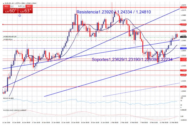 La sesión de hoy Lunes amanece con subidas en el par Eur/usd en búsqueda de los niveles de 1.23920 y en positivo en el Dax y en el Ibex-35.