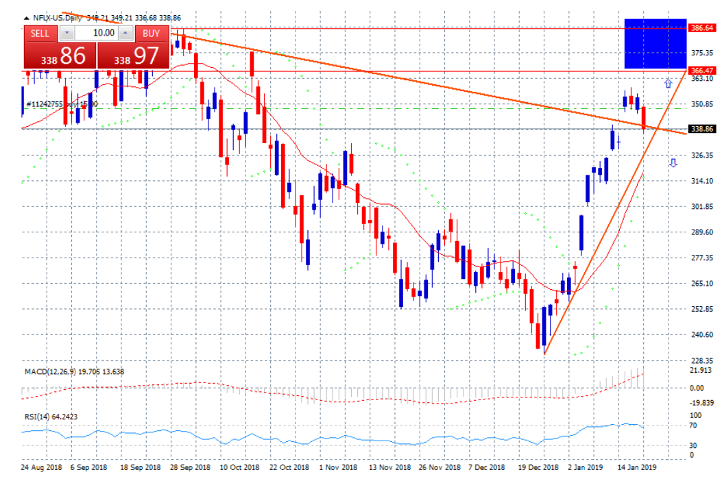 Hoy inicia la cotización semanal en EEUU de las acciones, tras el día festivo de ayer, por tanto, especial atención a la evolución de NETFLIX, que después de la publicación de sus resultados sufrió caídas del 3,99 % el viernes, para cerrar en los 339,10 $. La publicación de sus resultados ha dado un BPA (beneficio por acción) superior a lo esperado, si bien, los ingresos por abonados disminuyo y por tanto, estamos viendo que el mercado cuando no se cumplen en este momento el 100 % de las previsiones, castiga inmediatamente al valor. En mi opinión la acción tiene un importante crecimiento y por tanto, retrocesos en el valor pienso que puede ser una oportunidad de entrada. El precio objetivo en los próximas semanas lo situó en niveles de 380 / 391, frente al cierre del viernes de 339,19 $. Recordar que los valores tecnológicos tienen mucha volatilidad y por tanto, la entrada en estos valores, representa importantes variaciones diarias en su cotización.