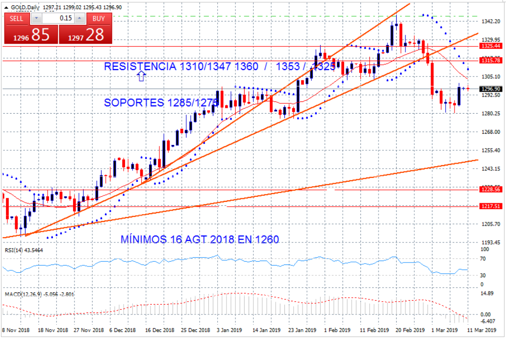 En cuanto a las materias primas la sesión del viernes nos dejo un movimiento interesante en el activo Oro/usd, y tras el recorte que viene realizando el valor desde los niveles de 1347, la rotura al alza de los niveles de 1300/1310, en mi opinión, puede representar una ocasión de entrada en compra al alza.