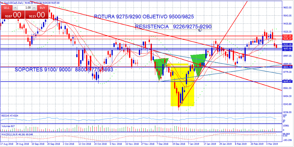 Nuestro indicador IBEX-35, está luchando por consolidar los niveles de 9100/9000. Técnicamente son los niveles a vigilar, mientras que estos niveles los aguante y no los perfore a la baja, nos puede representar una ocasión de confeccionar cartera. La rotura de los niveles comentados a la baja, nos daría un nuevo impulso bajista en la búsqueda de los niveles de 8.900/8800.