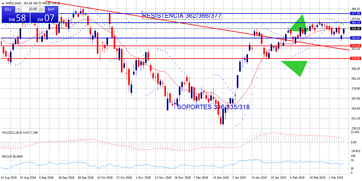 Técnicamente Netflix rompió su canal bajista el día 04 febrero con la rotura al alza de los niveles de 342/345. Se está moviendo desde inicios de febrero en un canal de lateralización con resistencia en niveles de 366 y soporte en niveles de 342. Mi opinión sobre el valor es que va a realizar un impulso alcista a buscar los niveles de la parte alta del canal en la cuota de 366 “objetivo de cierre”, y si rompe este nivel al alza el siguiente objetivo lo tiene en 376/378.