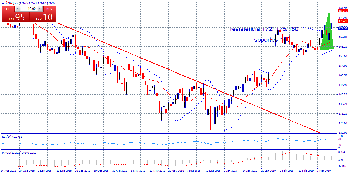Técnicamente Facebook, se está moviendo en un canal de lateralización desde el día 31 enero, con resistencia en 172 y soporte en 160. Está atacando la resistencia y si la rompe el objetivo de cierre lo sitúo en primer objetivo 175 y segundo objetivo 180.