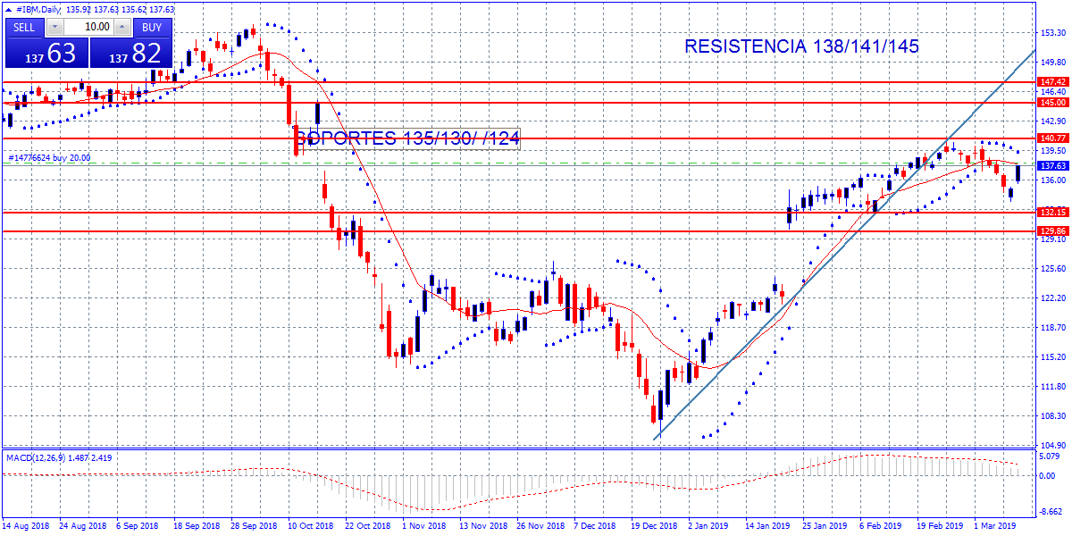 Técnicamente IBM, representa un gráfico muy parecido a las otras dos acciones comentadas. Mantiene un proceso de lateralización con resistencia en niveles de 140 y soporte en 130. En este momento está luchando con la rotura de la media móvil al alza y si lo consigue buscará el primer objetivo de cierre situado en la resistencia de 140. La rotura de esta resistencia al alza marcará el segundo objetivo situado en niveles de 145.