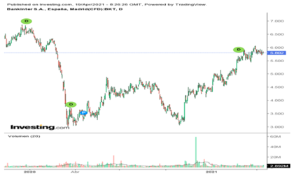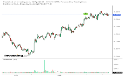 La acción de Bankinter ha tenido un comportamiento alcista muy fuerte desde inicio de enero del 2021, donde cerraba el 31 diciembre en 4,385 € y marcando en la cotización de hoy lunes 19 abril un cambio de 5,818 €.
